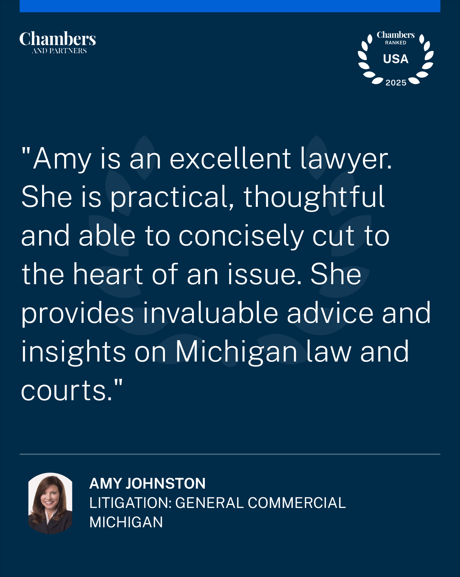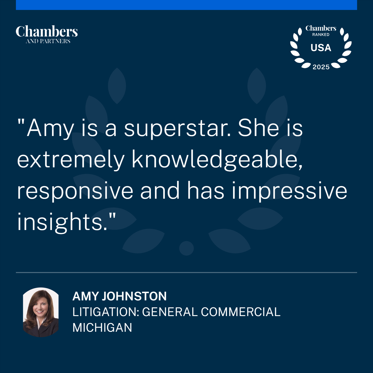 Amy is publicly recognized as a leading lawyer. She was named to the Legal 500 US Detroit Elite for Commercial Disputes in 2026 and has earned numerous additional accolades throughout her career. She was named in Crain’s Detroit Business’ Notable Litigators and Trial Attorneys in 2025, Crain's Detroit Business' Notable Women in Law in 2024, and was honored for her leadership by Michigan Lawyers Weekly as a recipient of the "Leader in the Law" award in 2021, and “Women in the Law” award in 2014. Since 2020, she has been named as one of the Best Women Lawyers in America by Best Lawyers®, as well as recognized in the top 5 Women Lawyers and top 10 Women Business Lawyers by Leading Lawyers. In addition, she has been recognized on U.S. News & World Report's "Top 25 Women Lawyers in Michigan" list since 2016, "Top 50 Women Lawyers in Michigan" since 2011 and "Best Lawyers in America" since 2008. She has been a Fellow of the Litigation Counsel of America, the trial lawyer honorary society, since 2007.