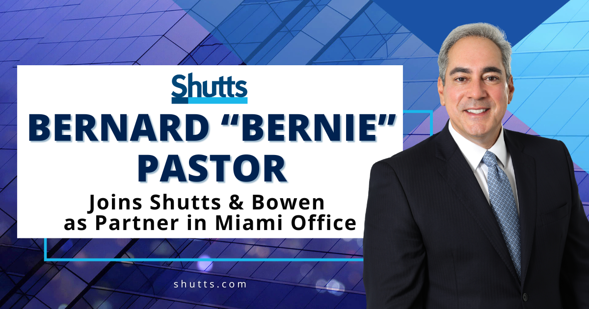 Shutts & Bowen LLP is pleased to announce that Bernard “Bernie” Pastor has joined the firm’s Miami office as a Partner in its Business Litigation Practice Group.
